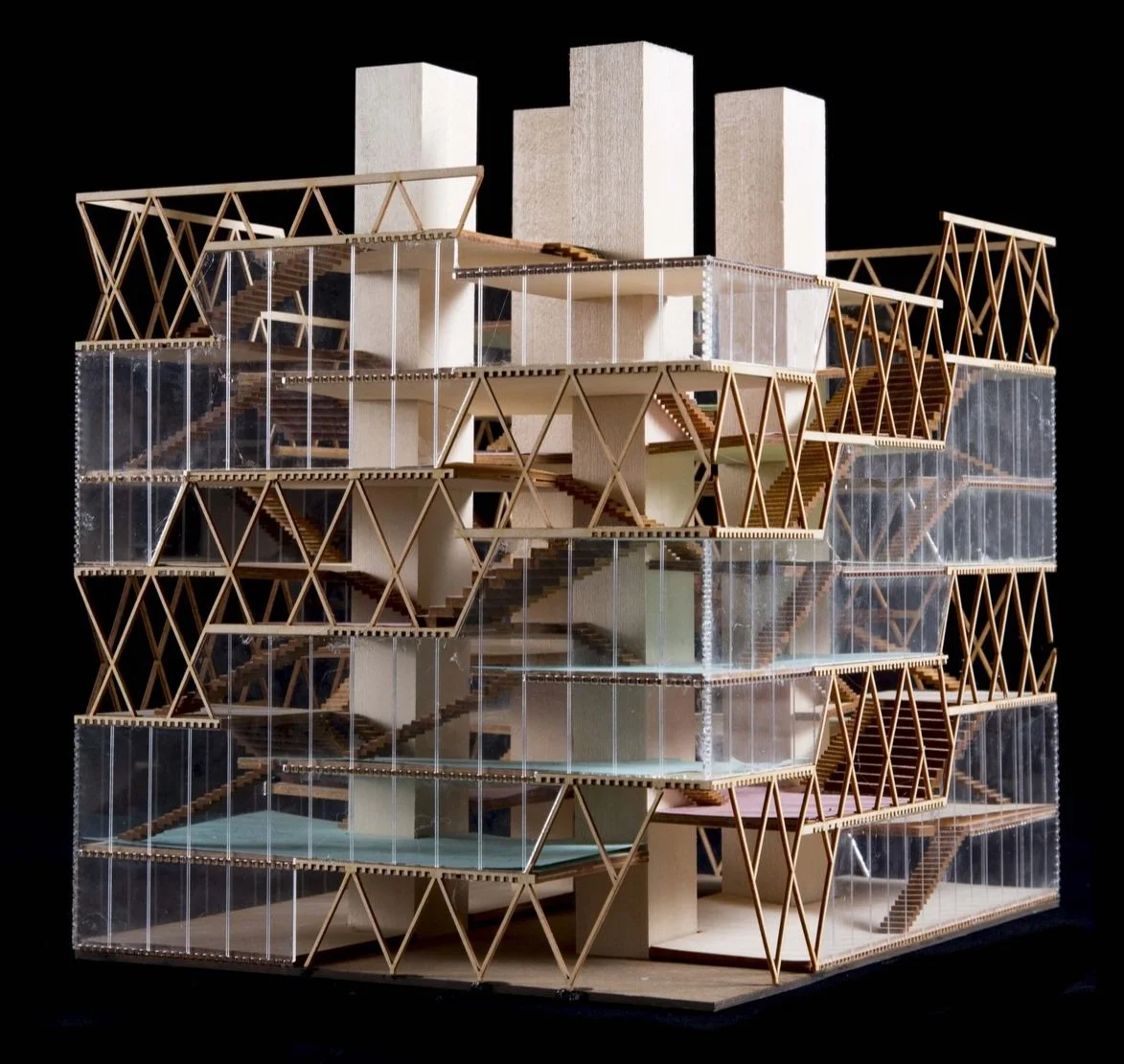 The site is located at the corner of Manhattan city block, where 2nd avenue and 6th street intersect. Starting from both ends, the two helix swirls all the way up along the center void consisting of four elevator shafts at each corner. The occupants' promenade becomes extremely simple as the helix itself becomes the route. Spaces from each helix are physically disconnected even though they are on the same level, however, they can be accessed through spaces generated between them.
